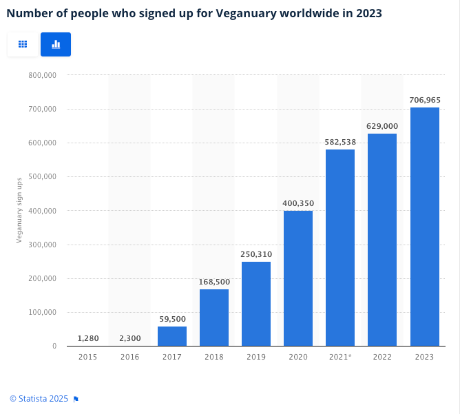 And where behaviour change is concerned, Veganuary has succeeded. In 2024, 1.8 million people signed up or engaged with Veganuary for help switching to an animal-free diet. That’s 1.8 million people who committed to trying animal-free food. Most animal advocates would kill to have this kind of impact, and the number is growing year on year.