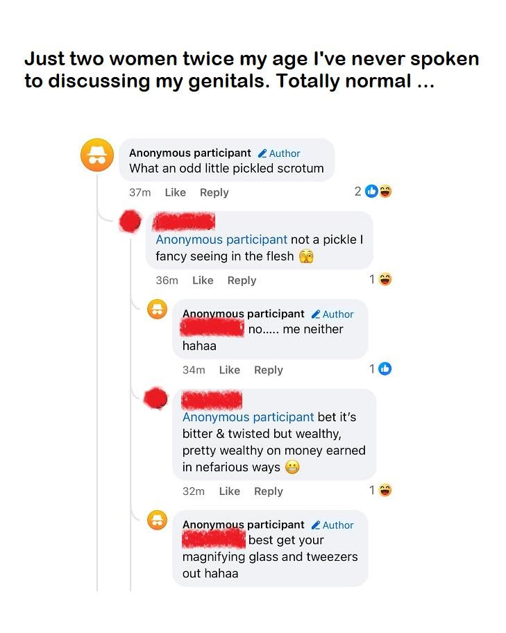But what might have started as one or two reasonable complaints has snowballed into tribalism and violent intent. As this group of individuals has grown, so has the intensity of their anger, and the lies that come with it. It’s an echo chamber of triggers—people constantly triggering each other with new information they either made up or misconstrued for dramatic effect. This outrages others in the group who tag more onto the stories, lies and insults, and the cycle just repeats until we end up with jokes about wishing Jordan’s mum swallowed and threats to physically harm him in the street.