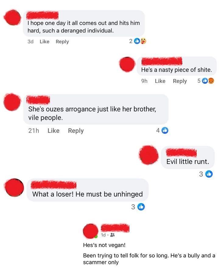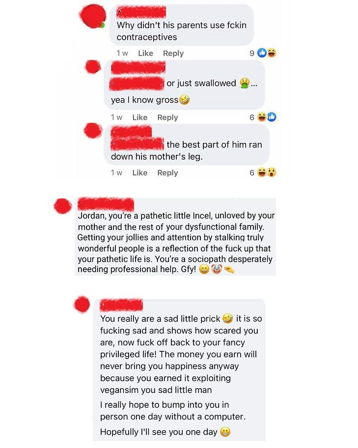 People wishing his parents had used contraceptives or “swallowed”, that the best part of him “ran down his mum’s leg”. That Jordan is an incel, “unloved by his dysfunctional family”, that he stalks people, is a sociopath and needs professional help. And threatening him with physical violence, with someone saying he “hopes to bump into him” after calling him a prick, and accusing him of exploiting veganism for money.